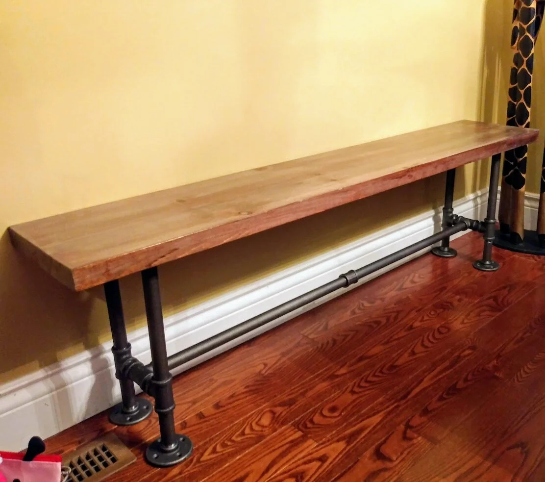 Custom made pipe leg bench for a client. The steel base and wooden top make a cool contemporary look with warm rustic charm.