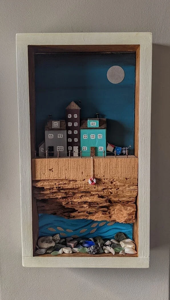 3D art at its best! These houses are made of wood and painted to look like a small coastal fishing town. A seek white frame adds the finishing touch.